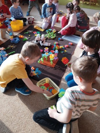 Jarní zahrádku jsme ve třídě vytvořili, různé stavebnice i skládanky jsme na ni použili