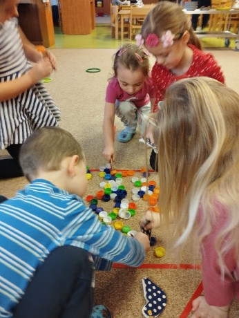 Ptačí týden - víčka jako zrníčka jsme kolíčkem zobali, do peříček foukali, po cestičkách skákali