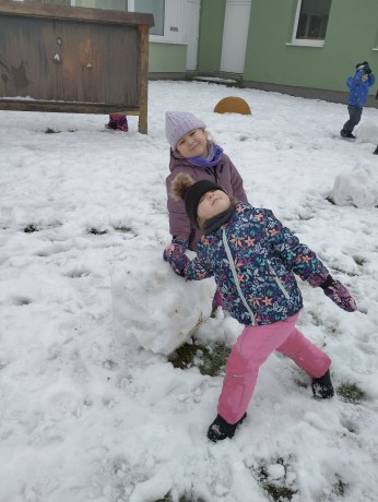 Sníh si pěkně užíváme, na kluzácích jezdíme a velké koule tvoříme